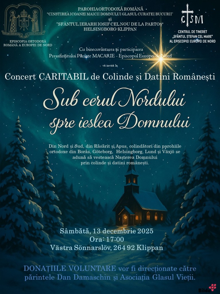 Concert CARITABIL de Colinde și Datini Românești – „Sub cerul Nordului, spre ieslea Domnului”, orele 17.00. ADRESA: Västra Sönnarslöv Kyrka (264 92 Klippan, Suedia).(CTSM)
