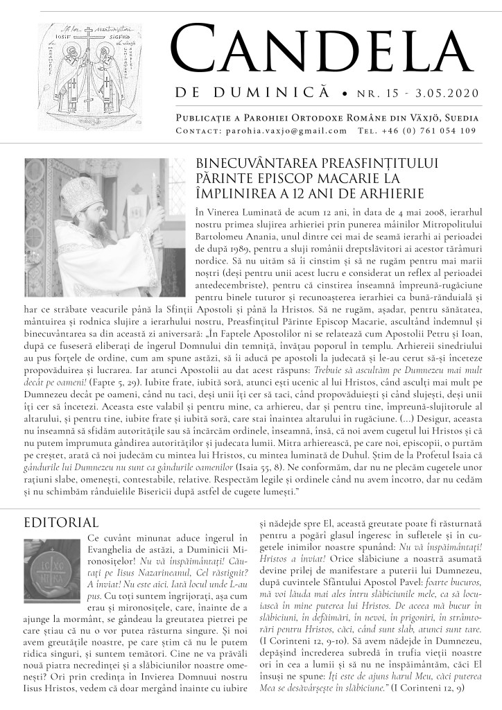 Hristos a înviat! Găsiți mai jos foaia noastră parohială din duminica aceasta, cu aniversarea și binecuvântarea ierarhului nostru, precum și un gând de întărire pentru Duminica mironisițelor în editorial.