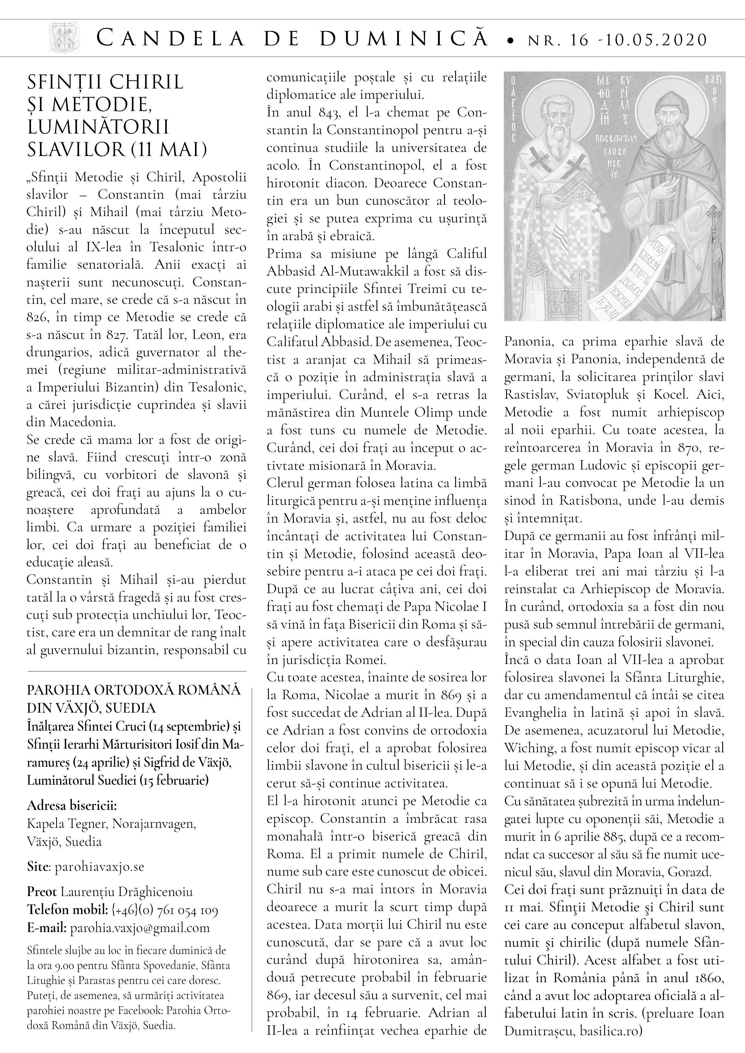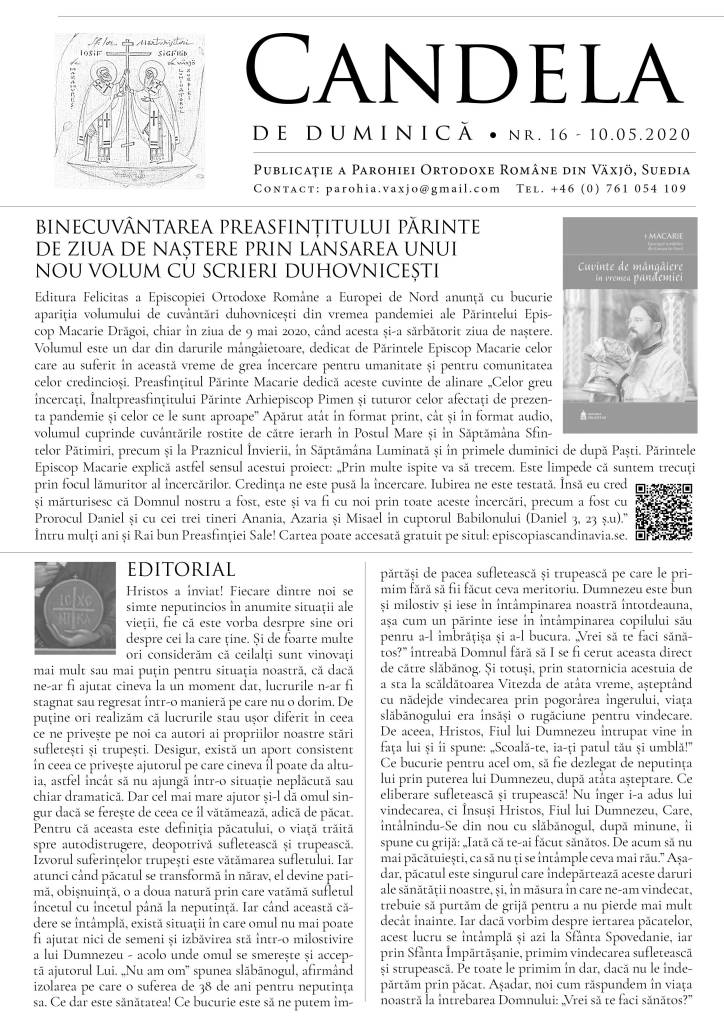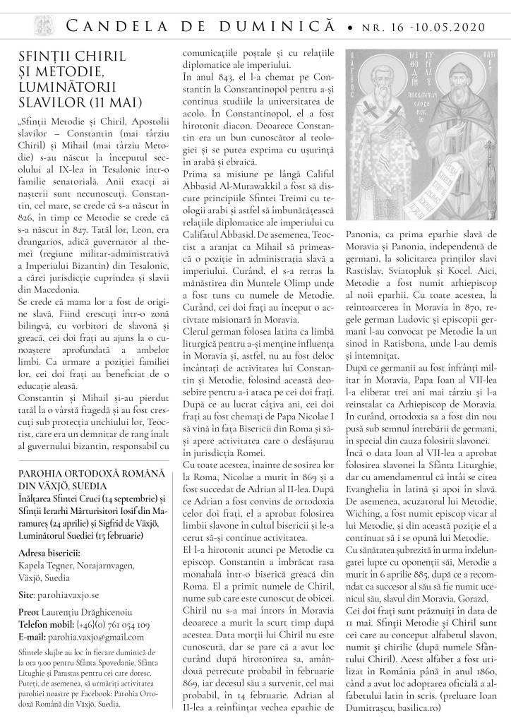 Vă atașăm foaia parohială din această duminică, în care găsim detalii despre noua carte a Preasfințitului Părinte Macarie, „Cuvinte de mângâiere în vremea pandemiei”, care poate fi descărcată și ascultată pe site-ul episcopiei (episcopiascandinavia.se), cuvânt de întărire în editorial și învățături din viața Sfinților Chiril și Metodie, luminătorii slavilor, prăznuiți la 11 mai.