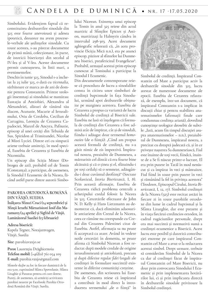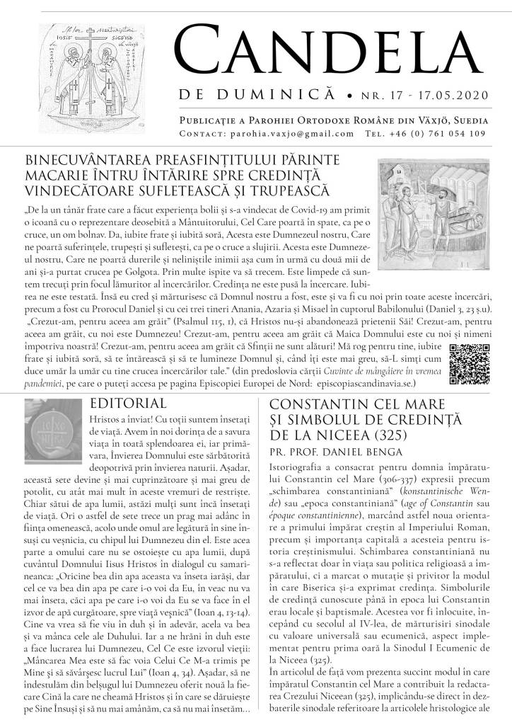 Vă atașăm foaia noastră parohială din această duminică, ce cuprinde cuvântul de binecuvântare al Presfințitului Părinte Episcop Macarie spre nădejde în vindecarea sufletească și trupească venită prin lucrarea Domnului, cuvântul de întărire din editorial și un articol despre Sfinții Împărați Constantin și Elena al Părintelui Profesor Daniel Benga.