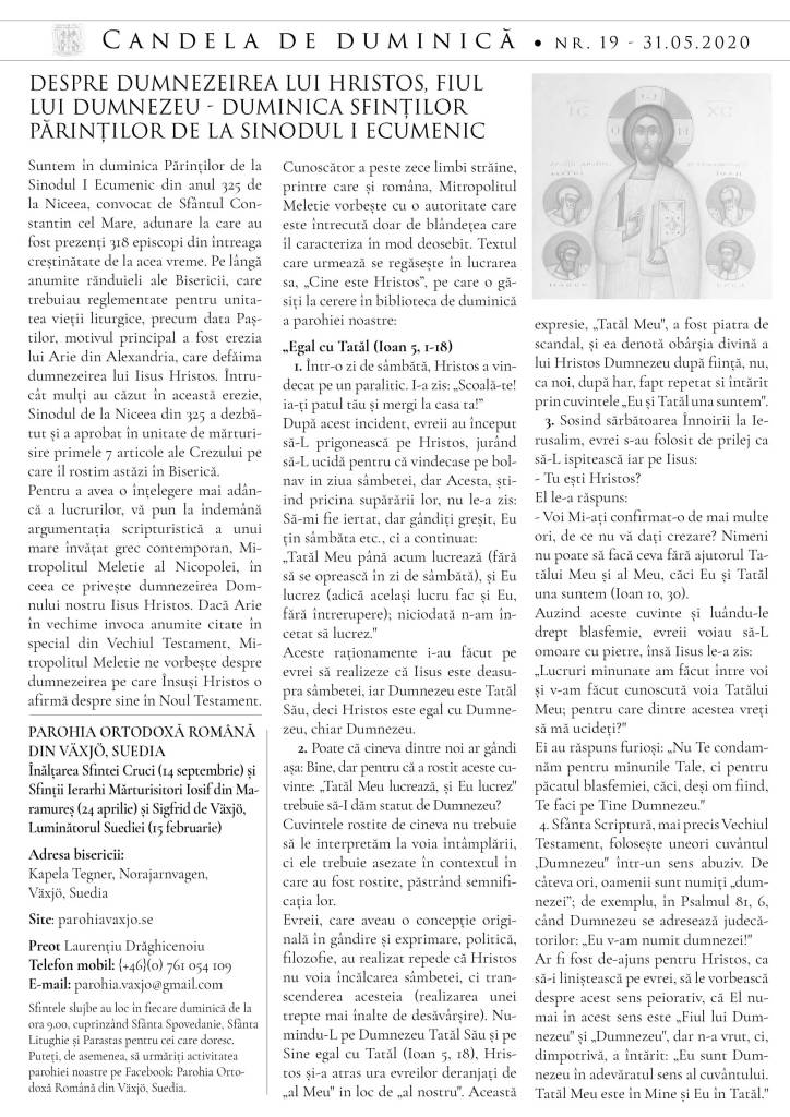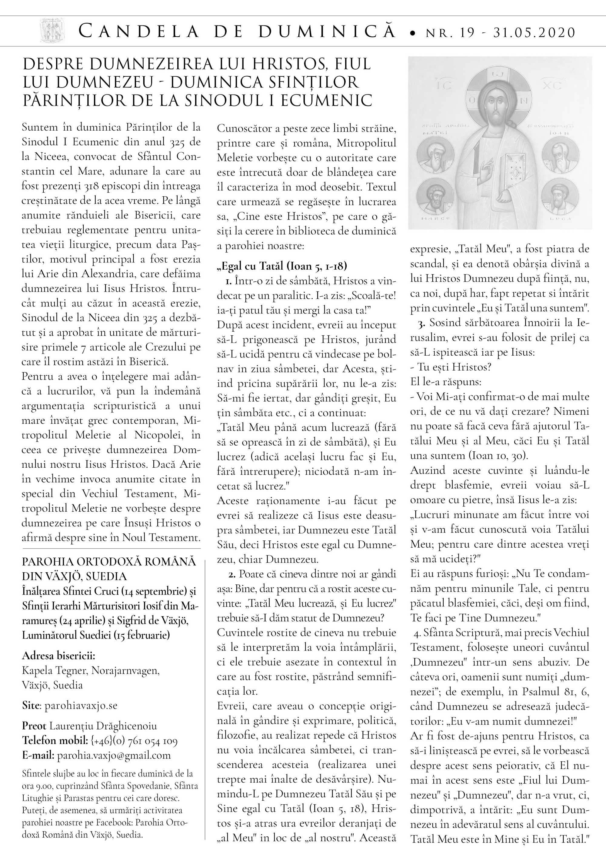 Hristos S-a înălțat! Vă atașăm cu drag Candela de duminică de astăzi, 31 mai 2020, care cuprinde cuvântul de binecuvântare al Preasfințitului Părinte Episcop Macarie în îndemnul de a urma calea deschisă de eroii neamului nostru, cuvântul de întărire din editorial, precum și câteva repere despre dumnezeirea Mântuitorului în această duminică în care pomenim pe Părinții de la Sinodul I Ecumenic. Mulțumim din suflet tuturor celor prezenți la biserică pentru împreună slujirea Sfintei Liturghii, precum și pentru întâlnirea în care am discutat statutul și organizarea asociației care va reprezinta parohia noastră în fața autorităților suedeze. Mulțumiri dimpreună și părintelui protopop Ovidiu-Theodor Băncilă pentru redactarea statutului și părintelui Horațiu Octavian Mureșan pentru ajutorul în completarea actelor!
