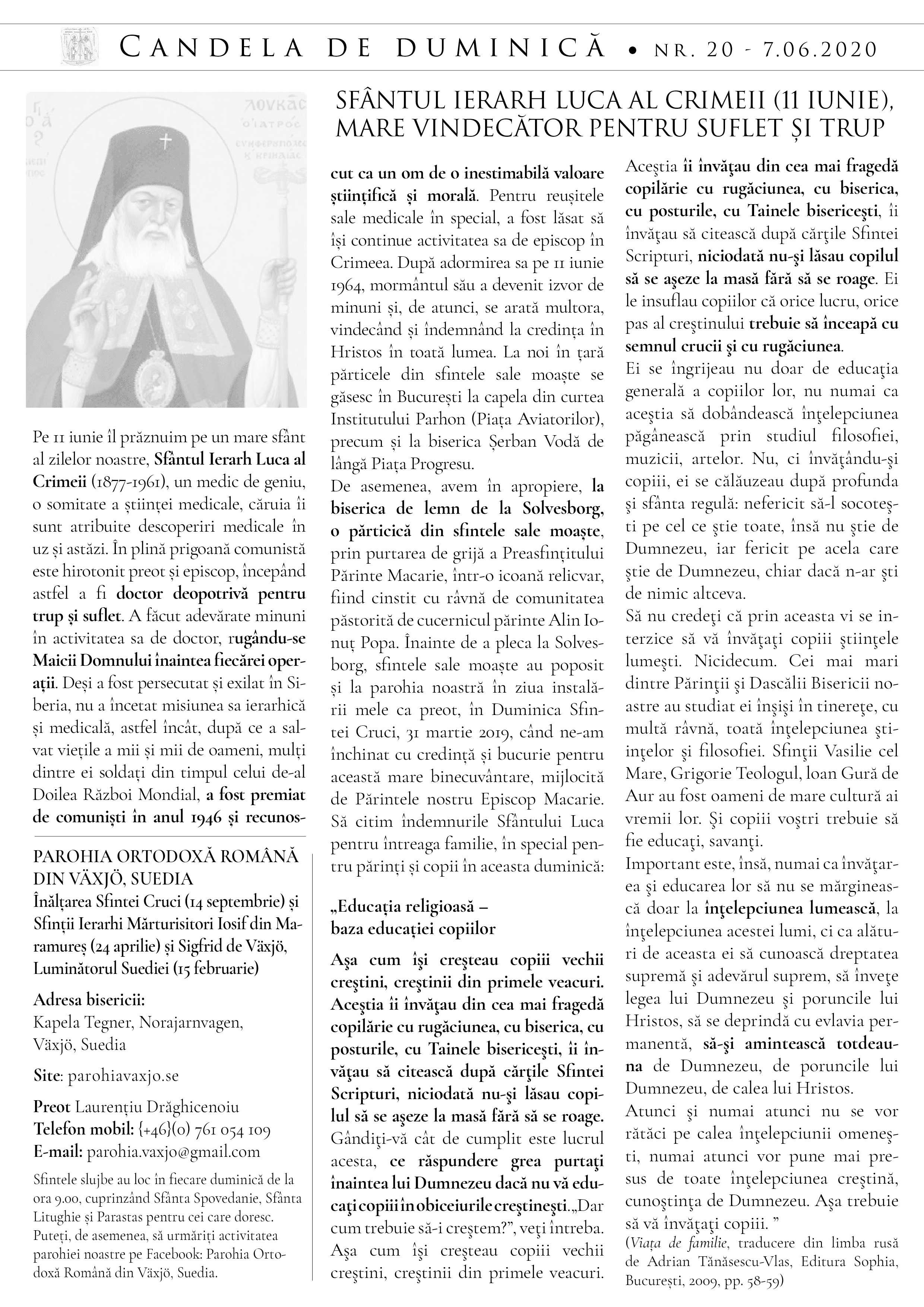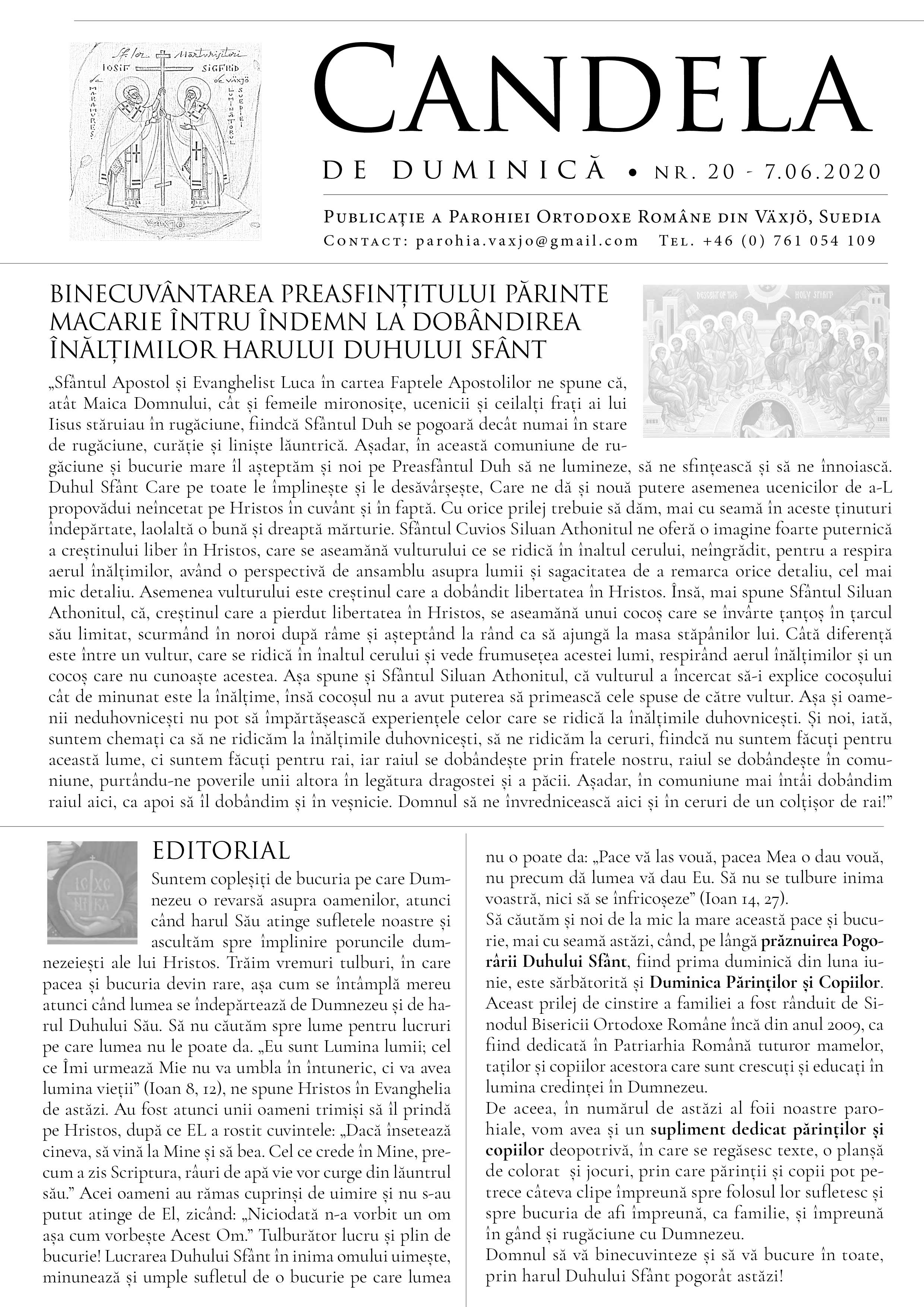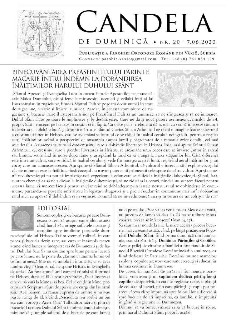 Vă atașăm ediția de astăzi a Candelei de duminică, care, ca în fiecare duminică, au fost împărțite tuturor din biserică, în care găsiți cuvântul de mare folos al Părintelui Episcop Macarie, gândurile de întărire și îndemn duhovnicesc din editorial la acest Mare Praznic și câteva cuvinte despre Sfântul Luca al Crimeii, cu câteva cuvinte de folos ale lui despre creșterea copiilor.