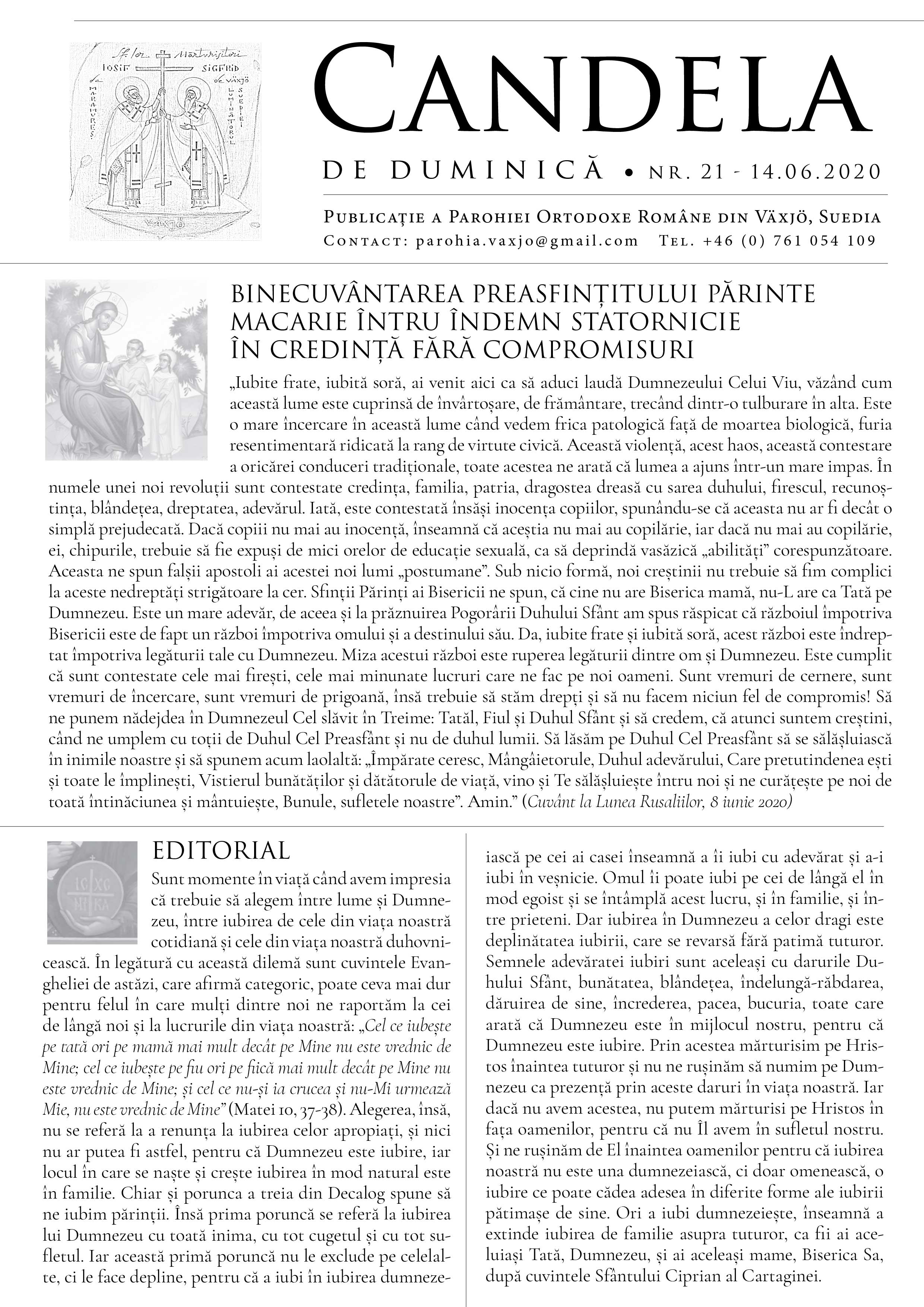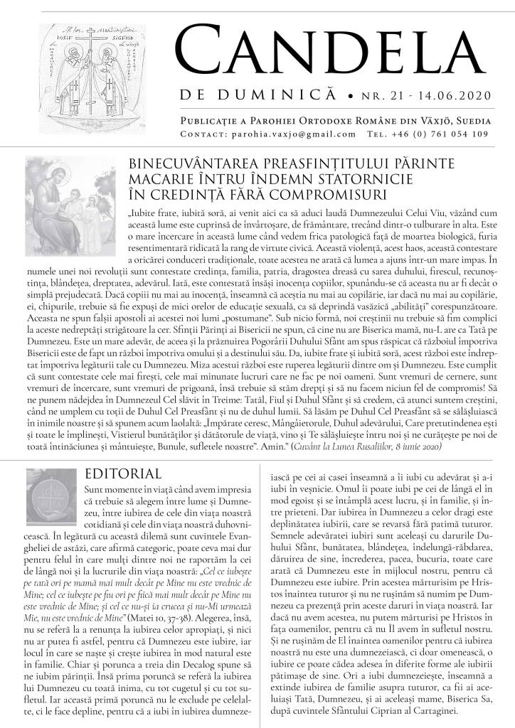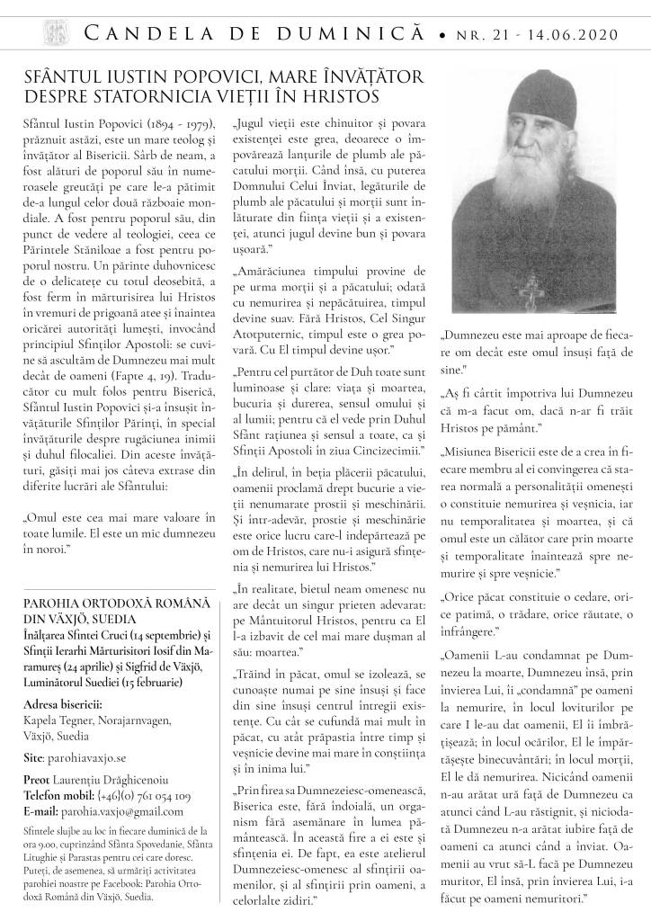 Doamne, ajută! Găsiți atașat numărul de săptămâna aceasta al foii noastre parohiale, oferită gratuit duminică tuturor celor prezenți la Sfânta Liturghie, în care vă puteți bucura de îndemnurile la statornicie în credință și în faptă ale Părintelui nostru Episcop Macarie, cuvântul de întărire din editorial și îndemnuri de mult folos duhovnicesc ale Sfântului Iustin Popovici, sărbătorit la 14 iunie.