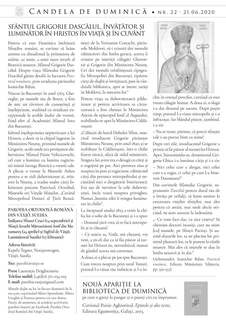 Găsiți atașată și foaia noastră parohială ce cuprinde cuvântul de mare folos al Părintelui Episcop Macarie, cuvântul de întărire din editorial și mărturia despre marele nostru ierarh prăznuit mâine, Sfântul Grigorie Dascălul, Mitropolitul Țării Românești, cu câteva detalii din viața și învățătura sa, potrivită pentru copii mici și mari deopotrivă 🙂.