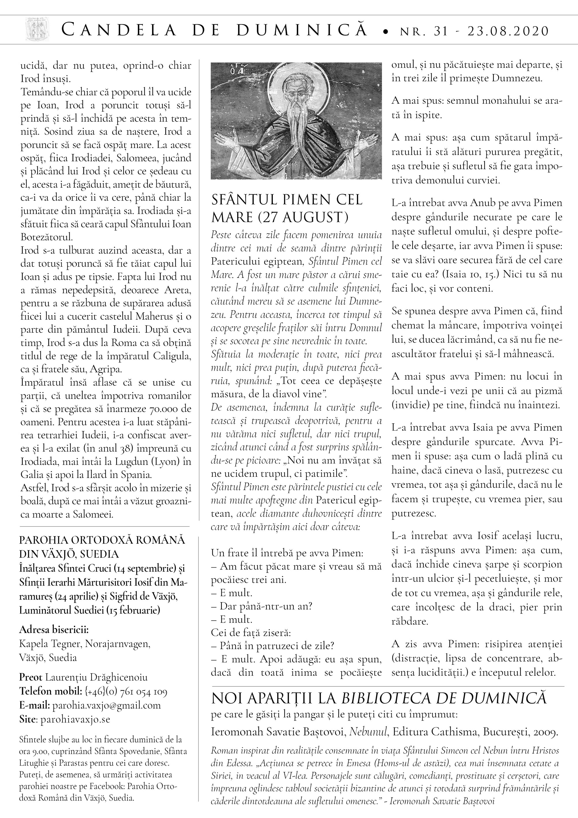 Atașăm foaia parohială de astăzi în care găsiți, pe lângă cuvântul de binecuvântare al Episcopului nostru, Preasfințitul Părinte Macarie, și pe lângă cuvântul preotului din editorial, rezumarea scripturistică și istorică al praznicului Tăierii Capului Sfântului Ioan Botezătorul, de sâmbăta viitoare, când va fi și post. De asemenea, găsiți și cuvinte minunate ale Sfântului Pimen cel Mare, pe care îl prăznuim joi, 27 august, de mare folos pentru cei care iubesc înțelepciunea părinților Patericului.