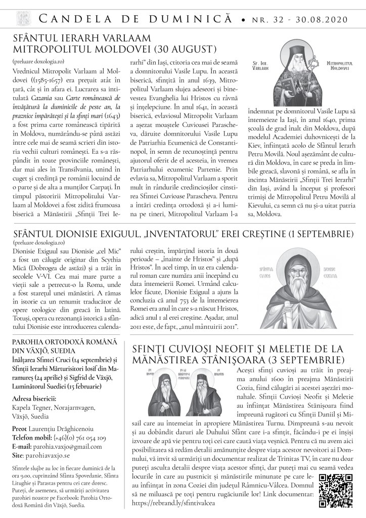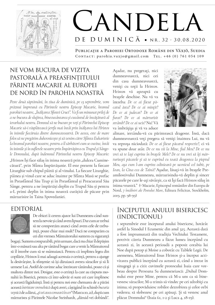 Cu bucurie anunțăm că vom avea VIZITA PASTORALĂ A PREASFINȚITULUI PĂRINTE EPISCOP MACARIE AL EUROPEI DE NORD peste două săptămâni, în ziua de duminică, pe 13 septembrie, când vom prăznui împreună „Înălțarea Sfintei Cruci”, hramul parohiei noastre. Va fi un minunat prilej de a ne bucura de slujirea, binecuvântarea și cuvântul de învățătură al ierarhului nostru. Vă așteptăm cu bucurie!
