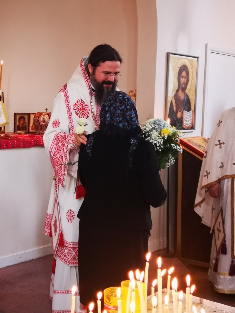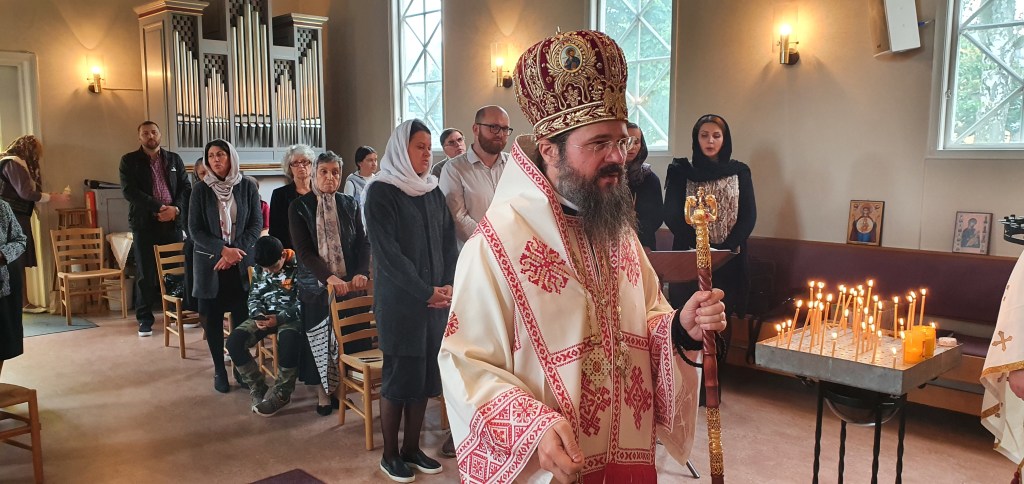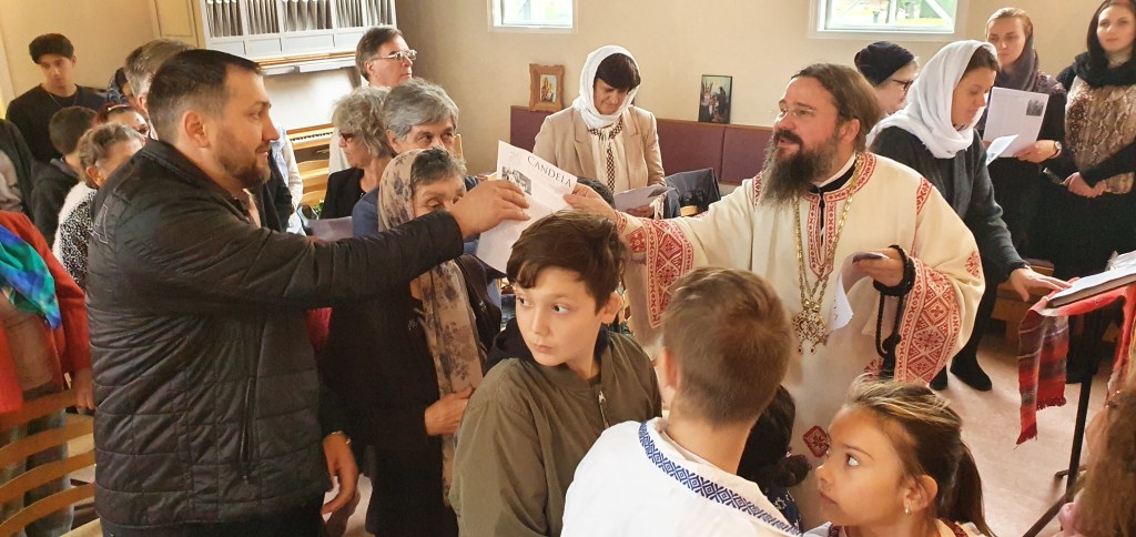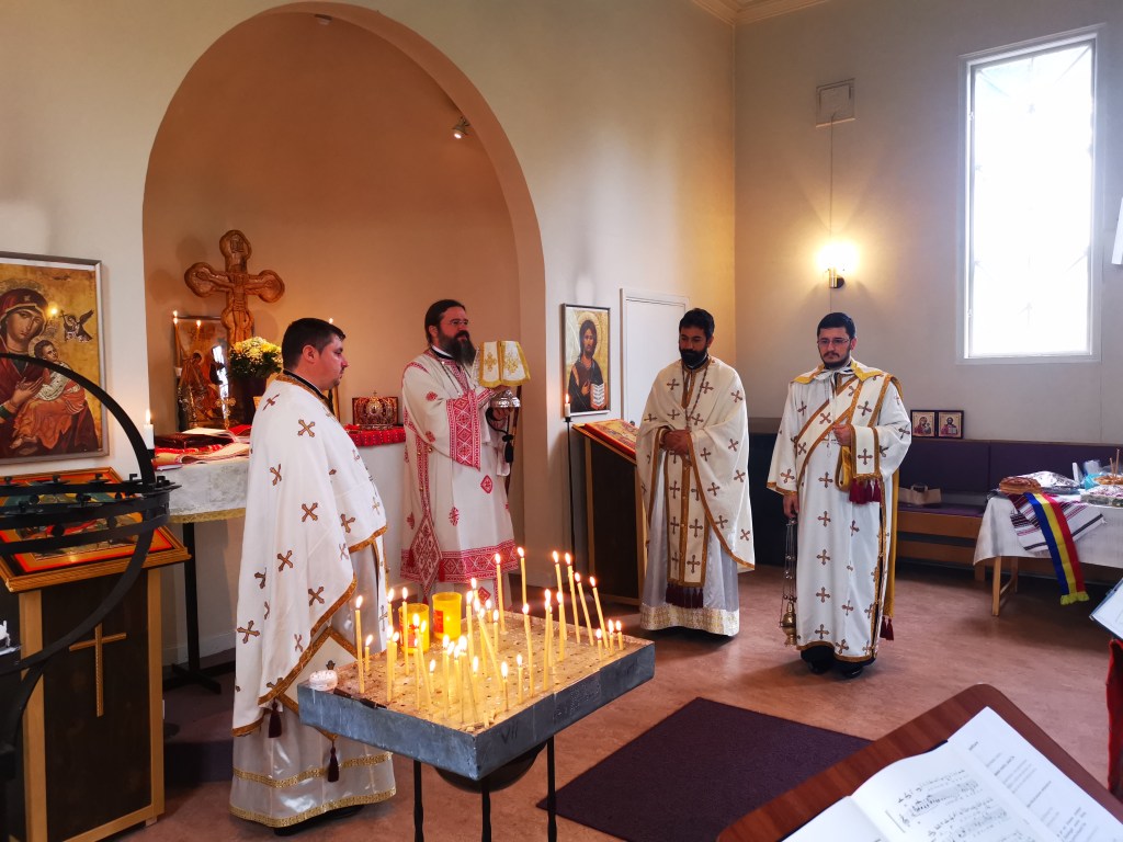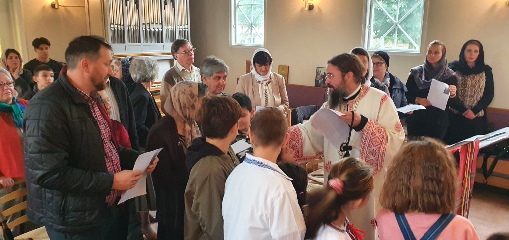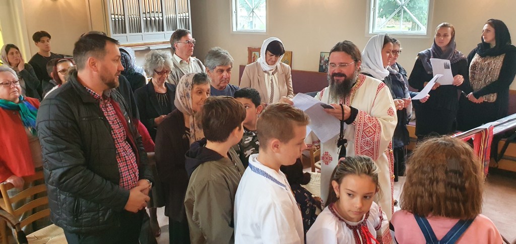 Slavă Domnului pentru toate și mai cu seamă pentru minunata zi a prăznuirii hramului parohiei noastre, Înălțarea Sfintei Cruci, în care ne-am bucurat de binecuvântarea și slujirea Preasfințintului Părinte Episcop Macarie al Europei de Nord, de purtarea de grijă părintească pe care o poartă fiecăruia dintre noi, grijă de care avem cu toții atâta nevoie aici în diaspora. Din cuvintele de învățătură pe care ni le-a pus la inimă Preasfinția Sa, redăm aici doar câteva: „Viața este un sacrament. Viața este un dar și de prea multe ori suntem îmbătați de senzualitate și evadăm în virtualitate, fiind orbiți și ațintiți cu mintea și cu ochii în acest cer virtual. Suntem orbi la ceea ce se întâmplă împrejurul nostru și, mai cu seamă, la ceea ce este înlăuntrul nostru. Așadar, să luminăm simțirile, preaiubiții mei, și să privim cu ochii inimii la Crucea Mântuitorului Iisus Hristos”.
