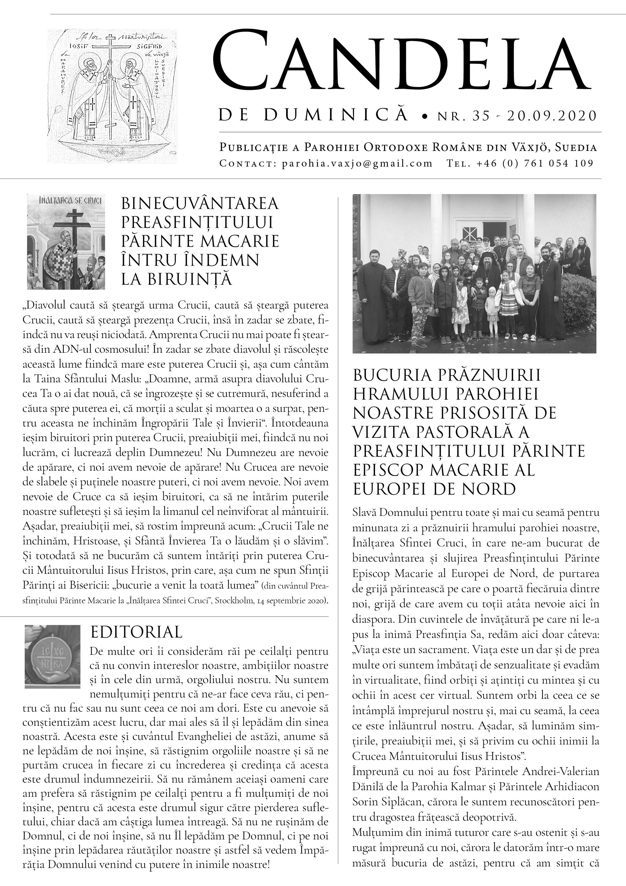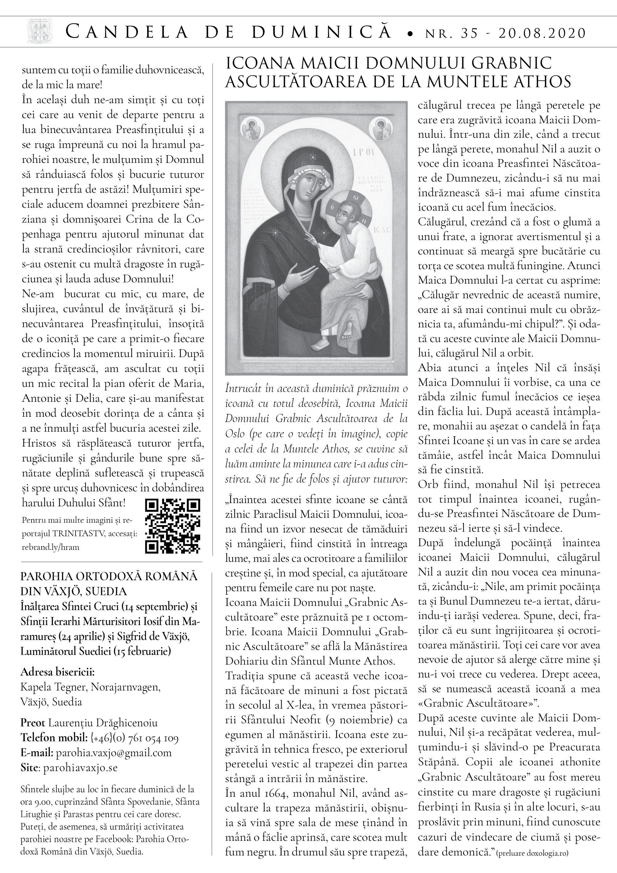 Vă îndemnăm spre lecturarea foii noastre parohiale din această duminică, în care găsiți cuvânt de binecuvântare și folos al Preasfințitului Părinte Episcop Macarie, de a cărui prezență și slujire ne-am bucurat săptămâna trecută la hramul parohiei noastre. Pe lângă editorialul preotului despre Evanghelia zilei, găsiți pe larg și detalii despre desfășurarea hramului din duminica anterioară. De asemenea, puteți citi și despre icoana Maicii Domnului Grabnic Ascultătoarea, a cărei copie se găsește la biserica parohiei din Oslo – cinstirea acesteia din urmă făcându-se în episcopia noastră în această duminică.