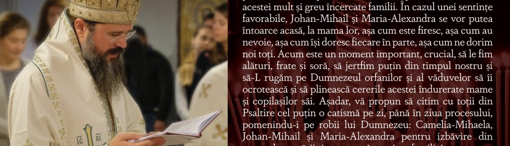 Preaiubiții mei, Vă rog și vă chem să ne unim în rugăciune pentru Camelia-Mihaela Smicală și copiii săi, Johan-Mihail și Maria-Alexandra. Pe 12 noiembrie va avea loc în Finlanda un proces foarte important, în care se poate decide soarta acestei mult și greu încercate familii. În cazul unei sentințe favorabile, Johan-Mihail și Maria-Alexandra se vor putea întoarce acasă, la mama lor, așa cum este firesc, așa cum au nevoie, așa cum își doresc fiecare în parte, așa cum ne dorim noi toți. Acum este un moment important, crucial, să le fim alături, frate și soră, să jertfim puțin din timpul nostru și să-L rugăm pe Dumnezeul orfanilor și al văduvelor să îi ocrotească și să plinească cererile acestei îndurerate mame și copilașilor săi. Așadar, vă propun să citim cu toții din Psaltire cel puțin o catismă pe zi, până în ziua procesului, pomenindu-i pe robii lui Dumnezeu: Camelia-Mihaela, Johan-Mihail și Maria-Alexandra pentru izbăvire din necazul separării și pentru reîntregirea familiei.
