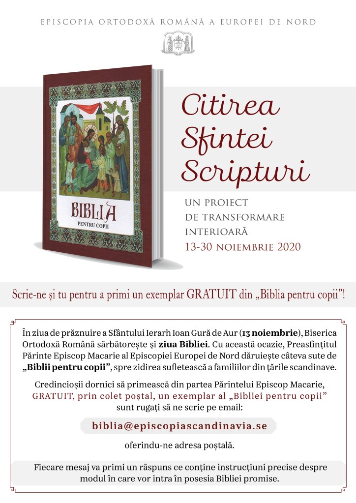 Credincioșii dornici să primească din partea Părintelui Episcop Macarie, GRATUIT, prin colet poștal, un exemplar al „Bibliei pentru copii” sunt rugați să ne scrie pe email (biblia@episcopiascandinavia.se), oferindu-ne adresa poștală.