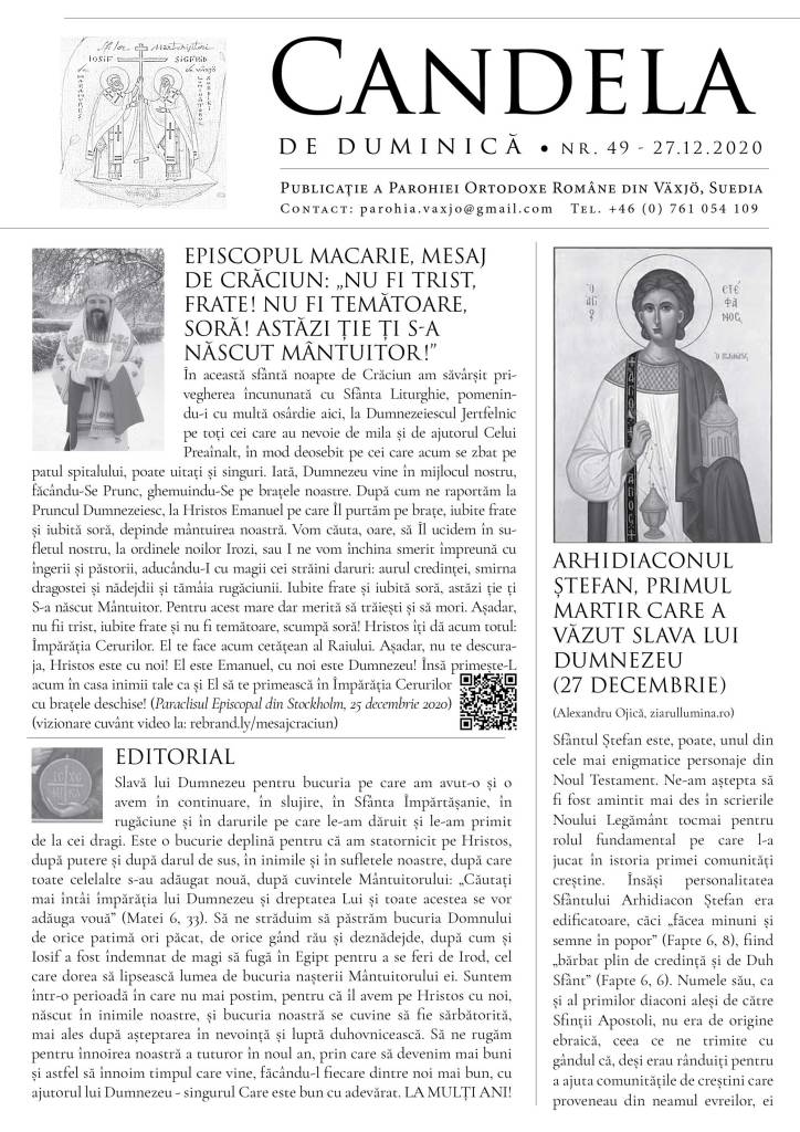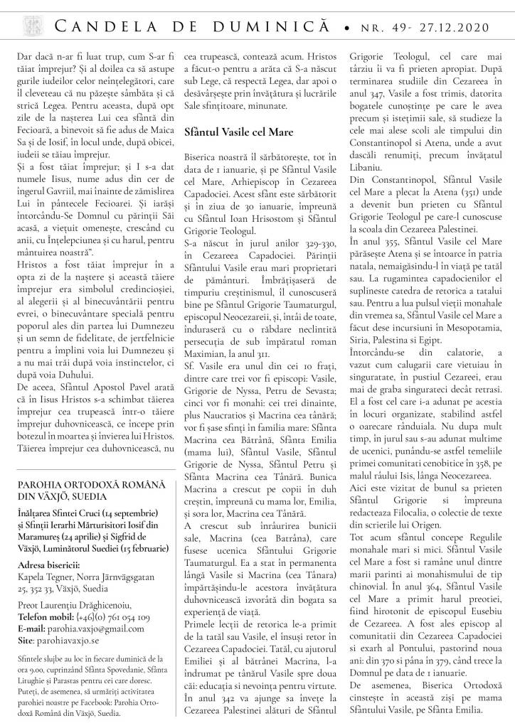 Slavă lui Dumnezeu pentru toate! Domnul să ne bucure și să ne lumineze pe toți în toată vremea! LA MULȚI ANI tuturor care poartă numele sfinților prăznuiți în aceste zile, Domnul să vă bucure și să îndrume spre tot lucrul cel bun! Vă atașăm foaia noastră parohială din această duminică în care găsiți mesajul de Nașterea Domnului al Părintelui nostru Episcop Macarie Drăgoi, cuvântul preotului din editorial și câteva învățături despre Sfântul Mucenic și Arhidiacon Ștefan și despre Praznicul Tăierii Împrejur a Domnului și despre Sfântul Vasile cel Mare. Să ne ajute Dumnezeu tuturor să fim mai buni și astfel să facem și anul care vine mai bun pentru noi și pentru cei din jurul nostru!