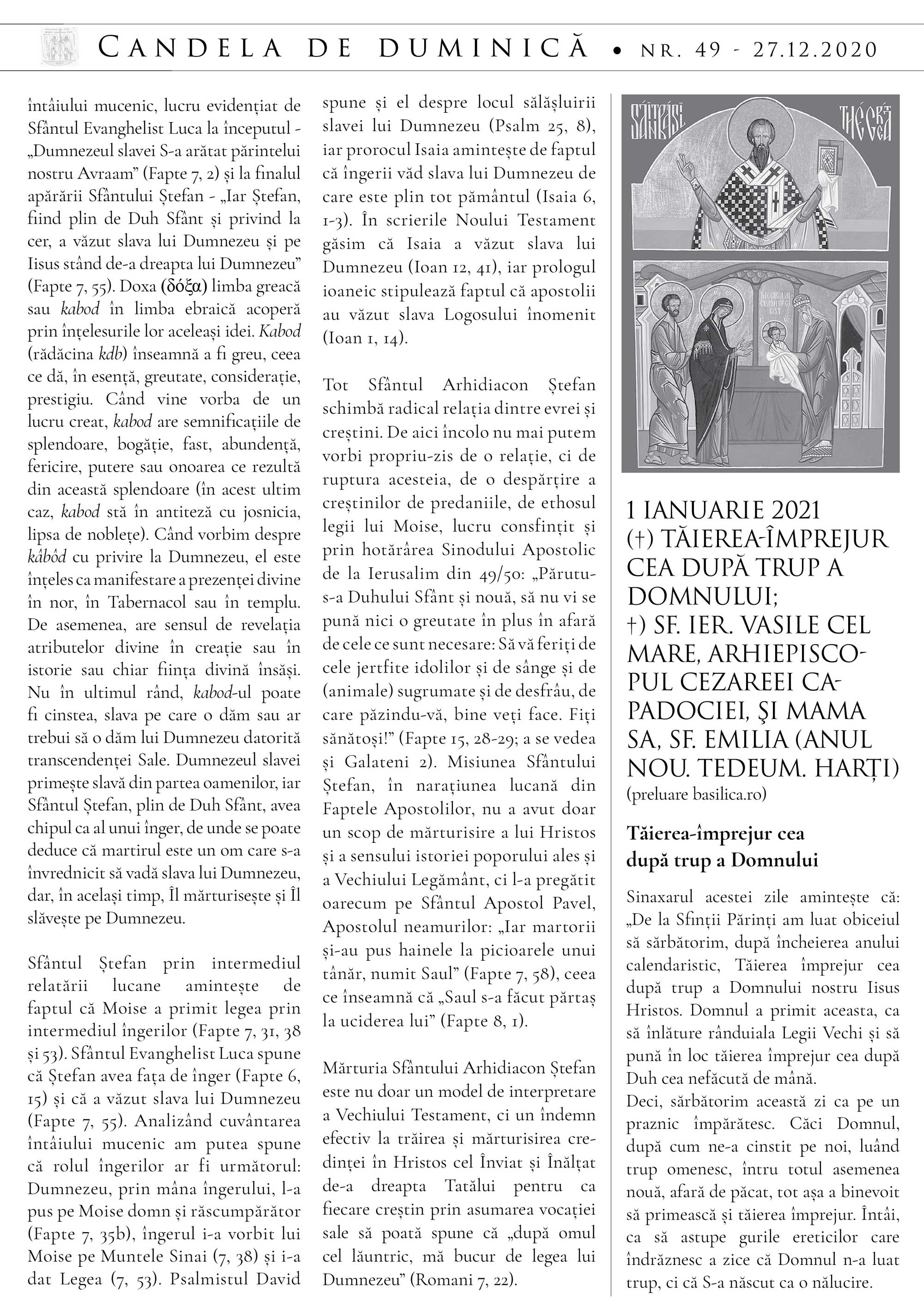 Slavă lui Dumnezeu pentru toate! Domnul să ne bucure și să ne lumineze pe toți în toată vremea! LA MULȚI ANI tuturor care poartă numele sfinților prăznuiți în aceste zile, Domnul să vă bucure și să îndrume spre tot lucrul cel bun! Vă atașăm foaia noastră parohială din această duminică în care găsiți mesajul de Nașterea Domnului al Părintelui nostru Episcop Macarie Drăgoi, cuvântul preotului din editorial și câteva învățături despre Sfântul Mucenic și Arhidiacon Ștefan și despre Praznicul Tăierii Împrejur a Domnului și despre Sfântul Vasile cel Mare. Să ne ajute Dumnezeu tuturor să fim mai buni și astfel să facem și anul care vine mai bun pentru noi și pentru cei din jurul nostru!
