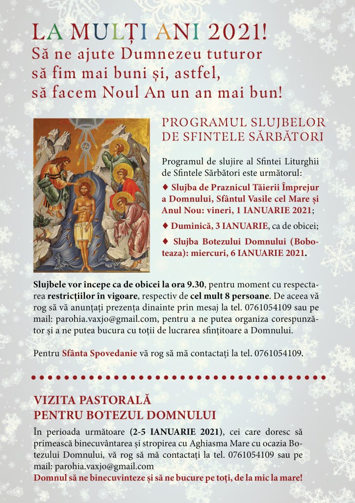 În perioada următoare (2-5 IANUARIE 2021), cei care doresc să primească binecuvântarea și stropirea cu Aghiasma Mare cu ocazia Botezului Domnului, vă rog să mă contactați la tel. 0761054109 sau pe mail: parohia.vaxjo@gmail.com