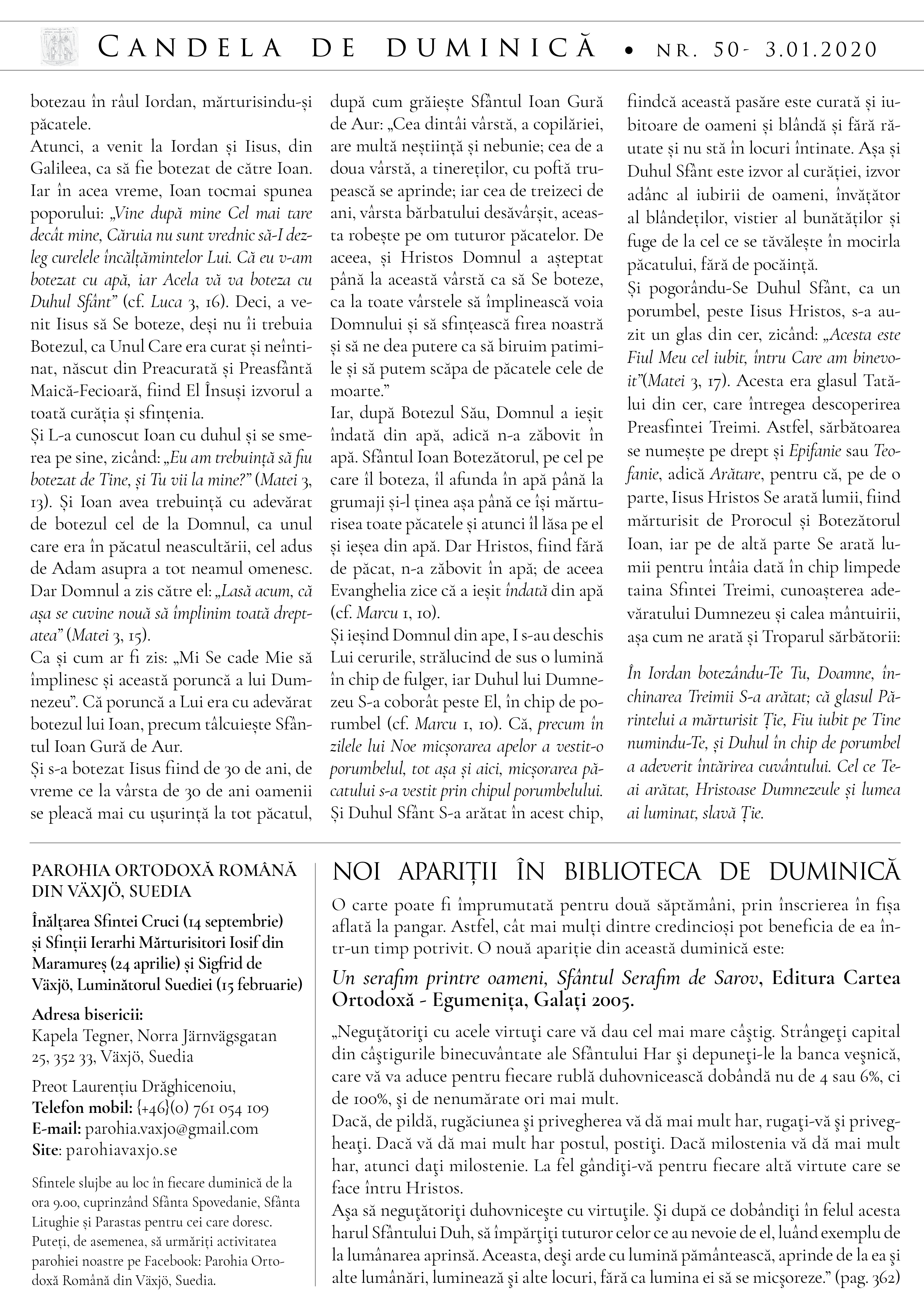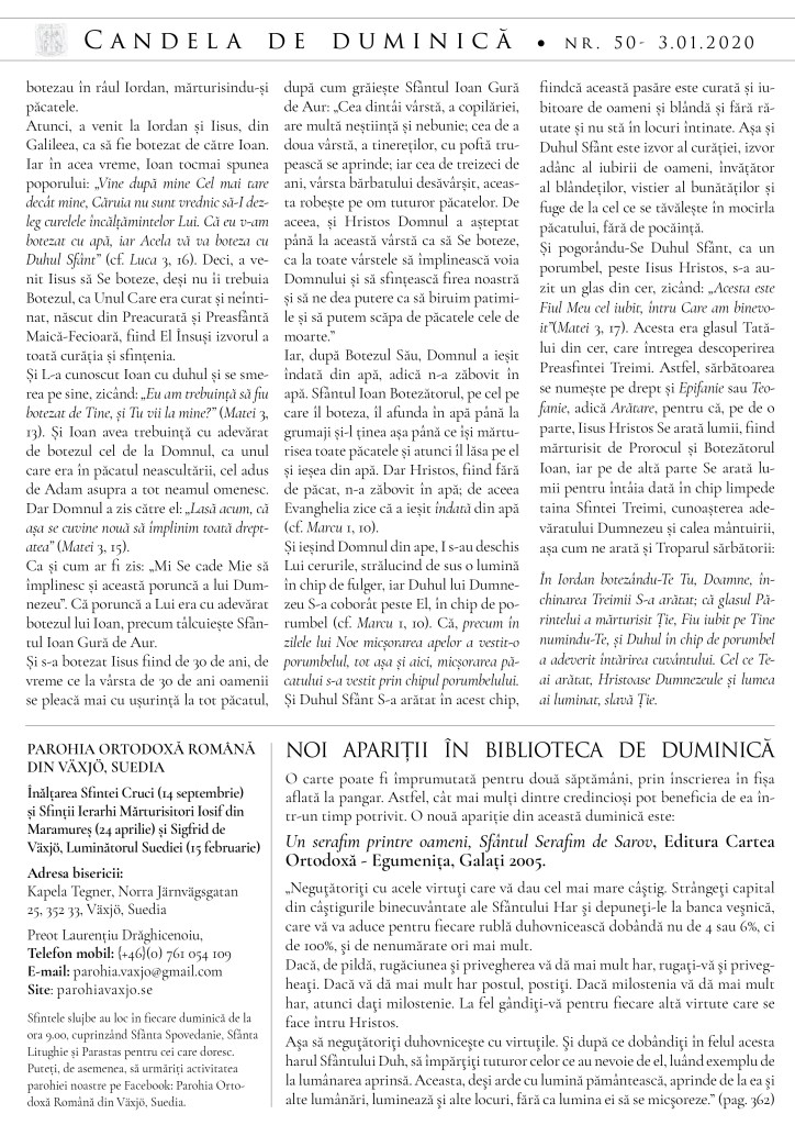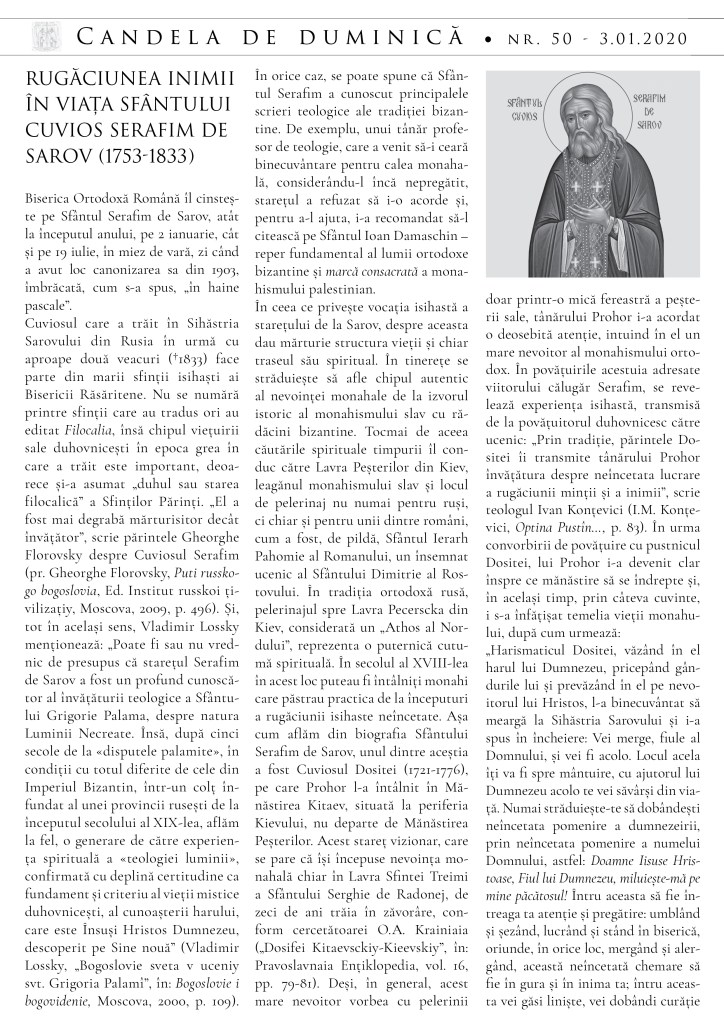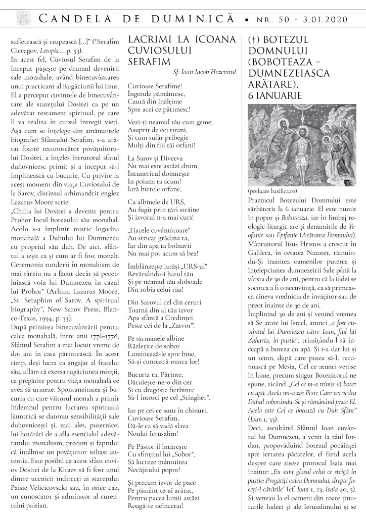 De asemenea, vă sunt la îndemână câteva detalii despre viața și rugăciunea inimii la Sfântul Serafim de Sarov și despre Praznicul Botezului Domnului.
