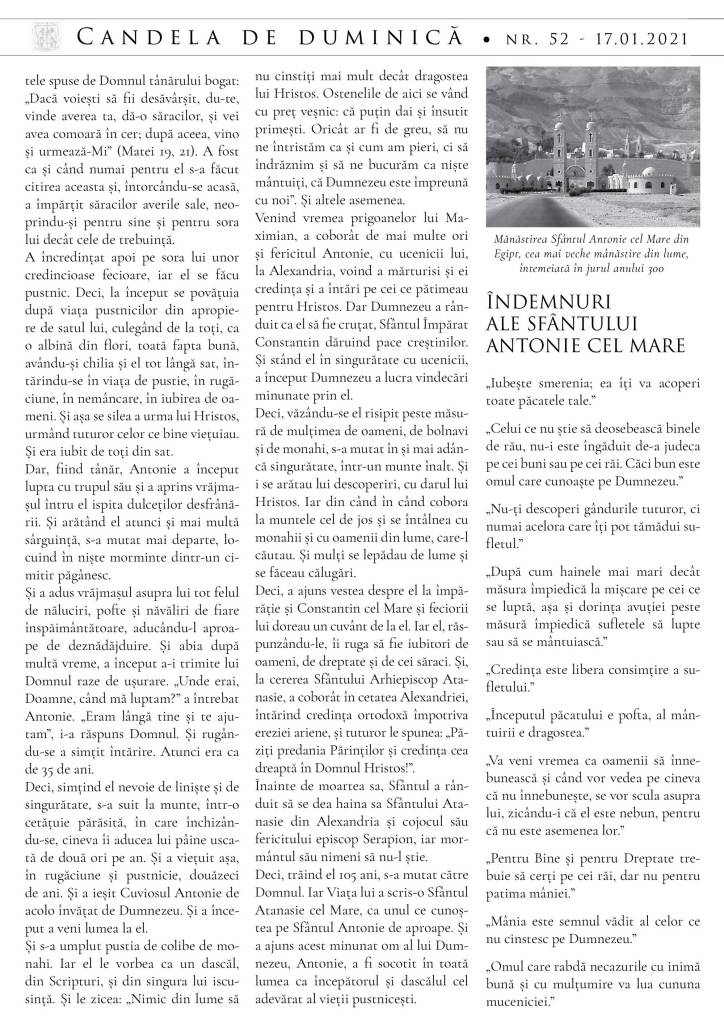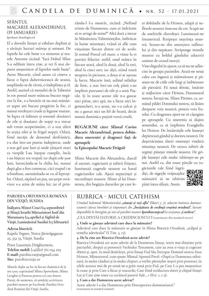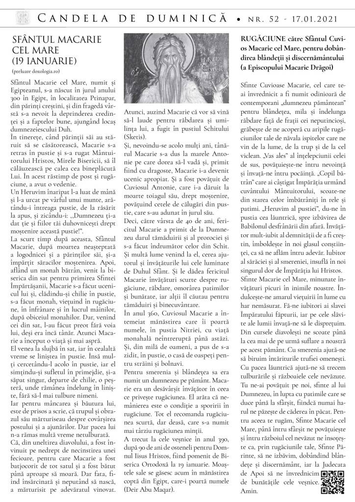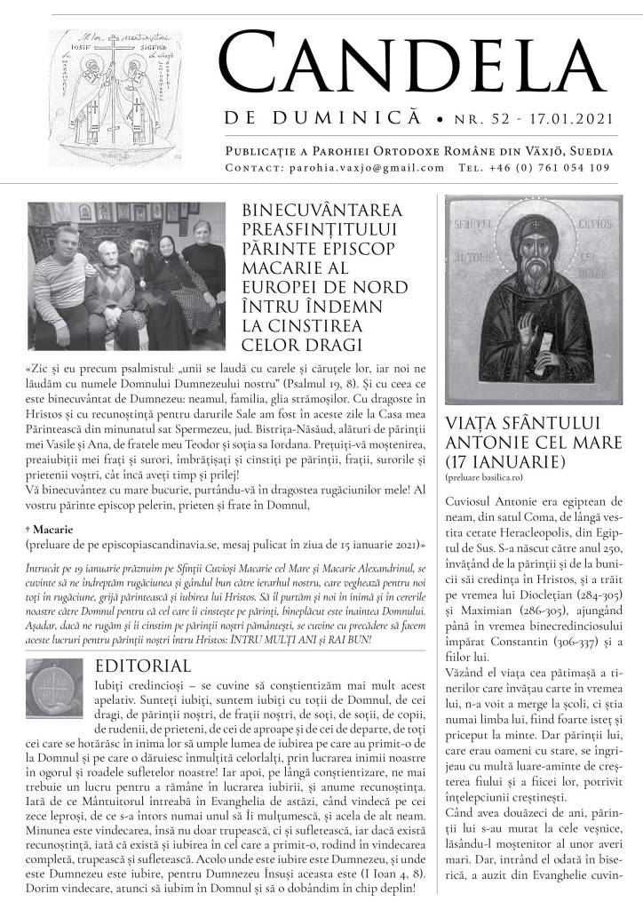 Vă atașăm foaia parohială din duminica aceasta, ce cuprinde binecuvântarea și îndemnul la prețuirea celor dragi a Părintelui nostru Episcop Macarie, cuvântul preotului din editorial și vieți ale sfinților prăznuiți în aceste zile. Se cuvine să îi felicităm pe cei care poartă numele acestora, mai cu seamă pe Părintele Episcop Macarie, pe care îl purtăm mereu în rugăciune, pentru prăznuirea Sfinților Cuvioși Macarie cel Mare și Macarie Alexandrinul pe 19 ianuarie, precum și pe cei pe care i-am sărbătorit si la Sfânta Liturghie, pe dna Antoaneta, pe Antonie și pe micul Anton. LA MULȚI ANI CU BUCURIE, SĂNĂTATE ȘI AJUTOR DE LA DOMNUL ÎN TOATE!