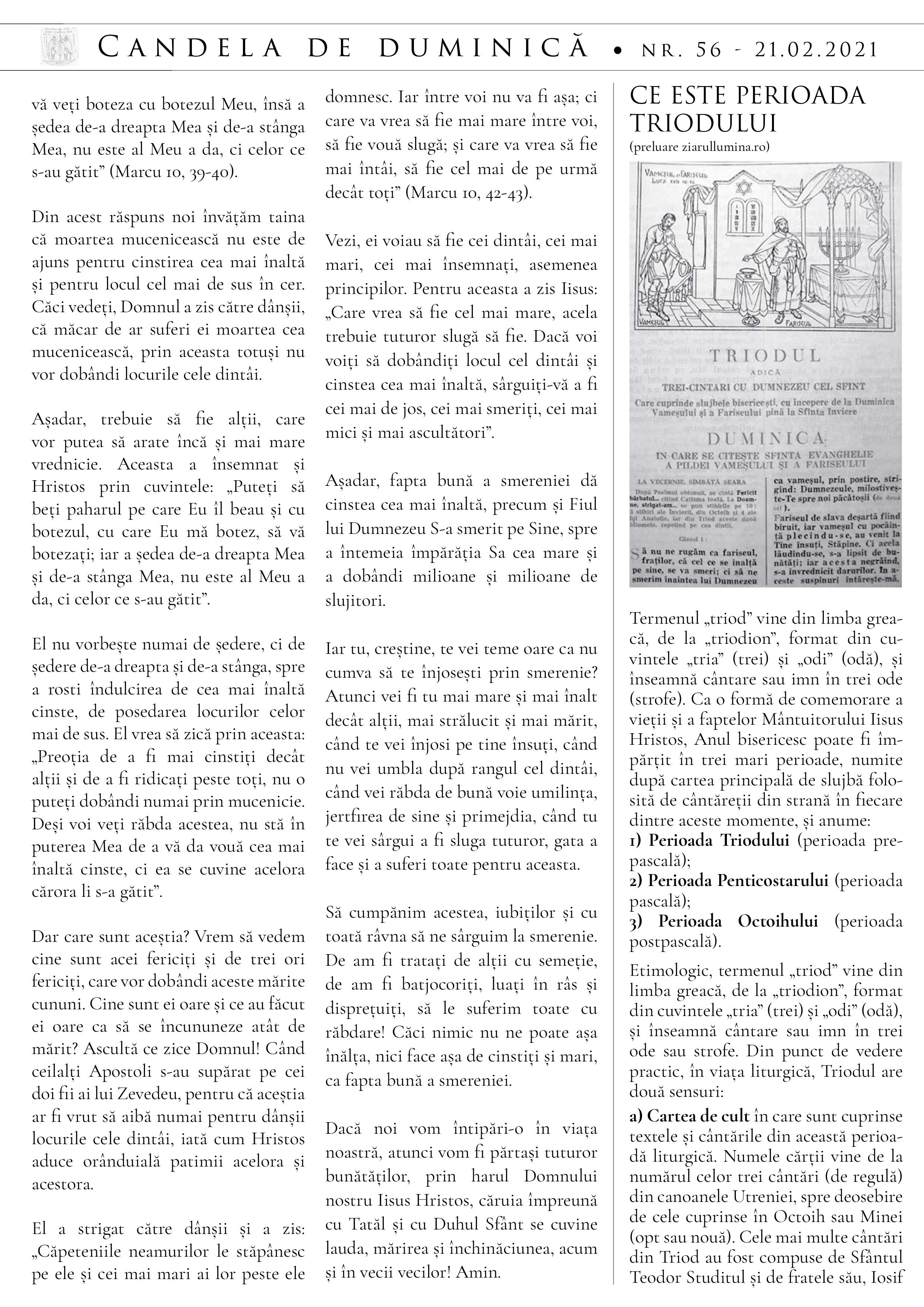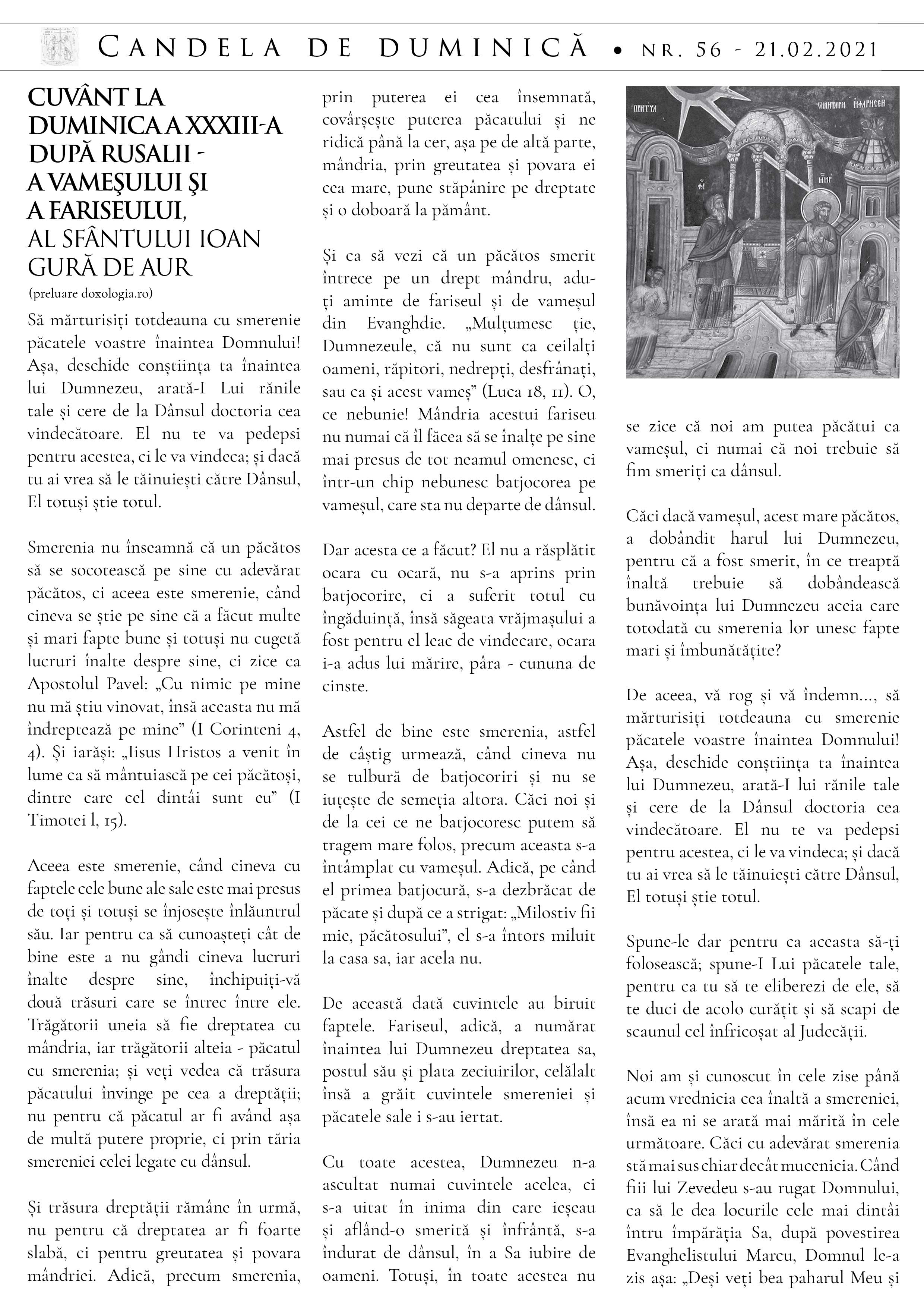 Iată că am ajuns în perioada Triodului, când începem pregătirea sufletească și trupească pentru sărbătorirea Pătimirilor și a Învierii Mântuitorului. Deși această pregătire este percepută în general mai ales o dată cu începutul Postului Mare, iată că Biserica începe primenirea noastră duhovnicească mai dinainte, vreme de trei săptămâni. Prima săptămână este dedicată pildei vameșului și fariseului, pentru a pune început bun pocăinței noastre, adică întoarcerii noastre lăuntrice către Dumnezeu. Dar de ce este nevoie să ne întoarcem la Dumnezeu, oare nu credem în El? Oare nu ne rugăm și venim la Biserică, de ce este această pildă de actualitate în toată vremea? Ei bine, mulți spun, chiar și în scaunul Spovedaniei: n-am omorât pe nimeni, n-am furat, sunt un om bun, nu am ce să mărturisesc. Iată cât de asemănător este acest discurs cu cel al fariseului: „Dumnezeule, Îți mulțumesc că nu sunt ca ceilalți oameni, răpitori, nedrepți, preadesfrânați, sau ca și acest vameș. Postesc de două ori pe săptămână, dau zeciuială din toate câte câștig.” De ce este asemănător? Pentru toate acele „nu”-uri sunt de fapt comparații cu alții: n-am omorât pe nimeni – ca alții; n-am furat – spre deosebire de alții care vin și au ce mărturisi, și așa mai departe. Unii chiar au impresia că cei care vin des la spovedanie fie sunt păcătoși care fac mereu păcate strigătoare la cer, fie sunt naivi și au complexul vinovăției, astfel că simt mereu nevoia să spună preotului lucruri nesemnificative. Dacă ar fi așa, atunci Sfântul Apostol Pavel, care se considera cel dintâi dintre păcătoși, era un vameș spre deosebire de cei care n-au ce mărturisi. Ei bine, ce măreț lucru ar fi să fim și noi astfel de vameși, ca Sfântul Apostol Pavel, având mereu conștiința păcatului și sensibilitatea sfințeniei. Pentru că aceastea vin din cunoașterea de sine în raport nu cu cei păcătoși, ci cu harul Duhului Sfânt. Dacă am avea pe Duhul, am plânge pentru păcatele noastre, pentru gândurile și apoi faptele care pornesc din ele, pentru că nu sunt sfinte. Iar dacă ne credem buni, iată o dovadă că nu îl avem pe Duhul Sfânt. Care să fie atunci începutul pocăinței? Cuvintele vameșului, care ne sunt la îndemână tuturor: „Dumnezeule, milostiv fii mie, păcătosului!”
