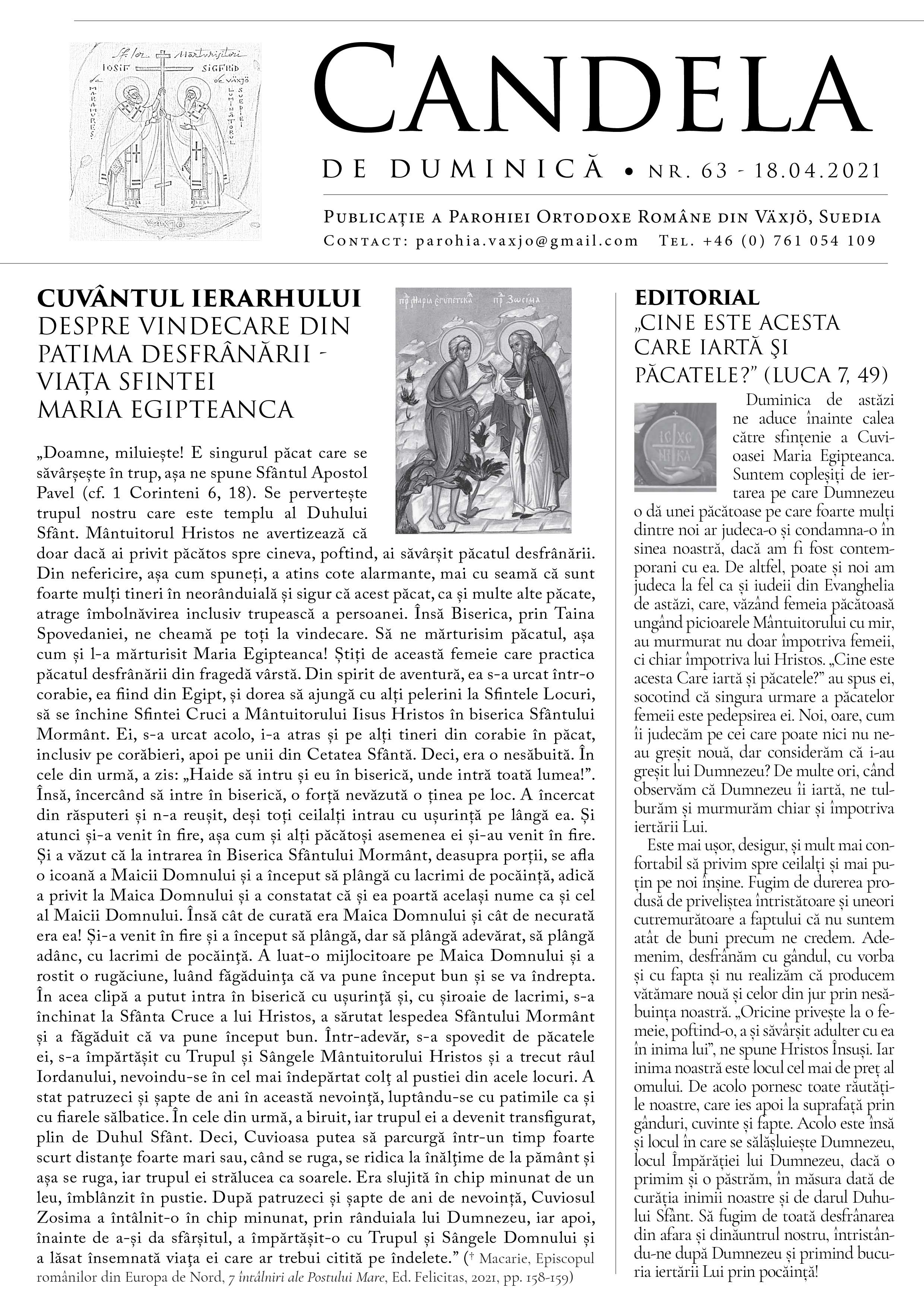 Domnul să vă păzească și să vă bucure pe fiecare cu mare mila Sa! Vă atașăm foaia parohială din această duminică, cu gândul și îndemnul să ne iertăm unii altora greșelile, mai ales în această perioadă a Postului Mare, din care a mai rămas doar puțin, și să ne apropiem de Pătimirea și Învierea Domnului cu sufletul cât mai curățit prin pocăință și iertare!