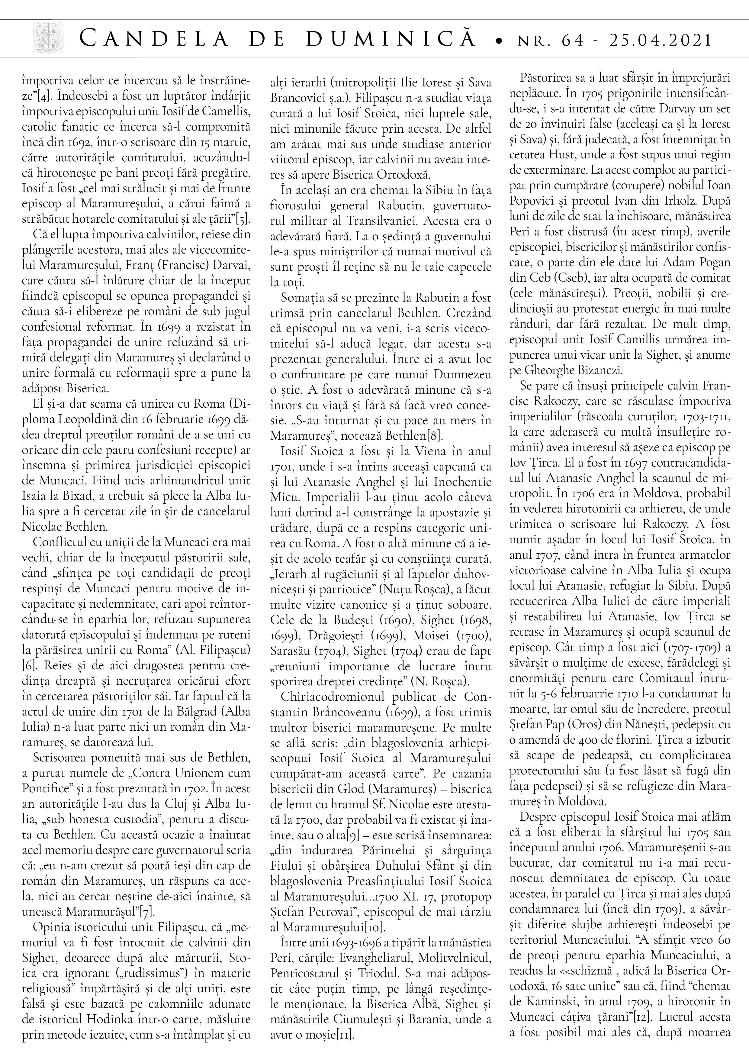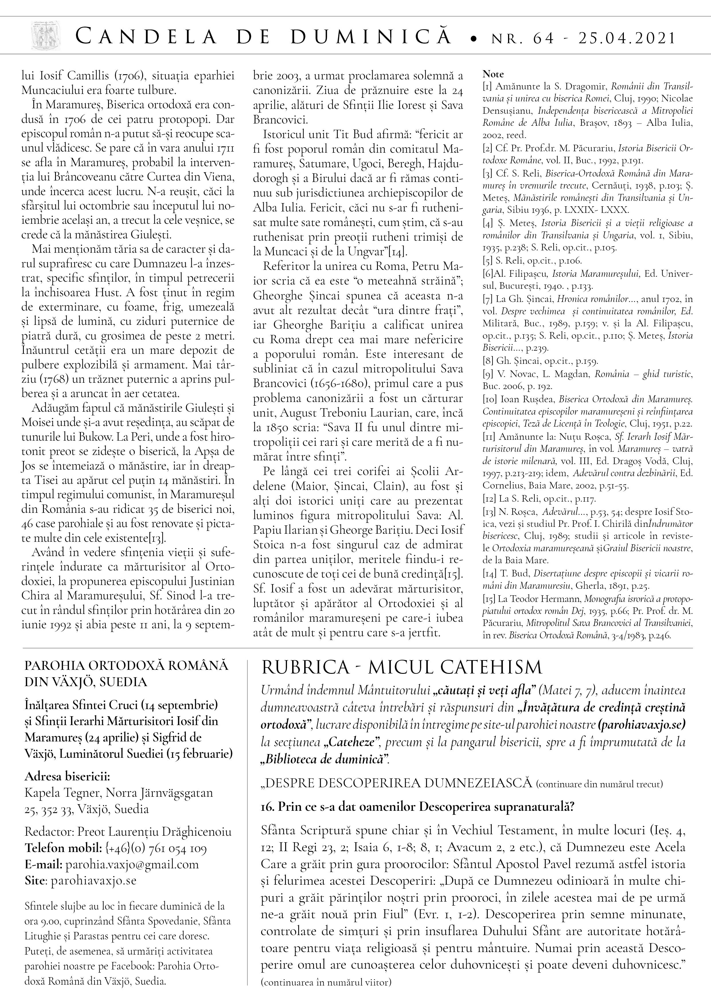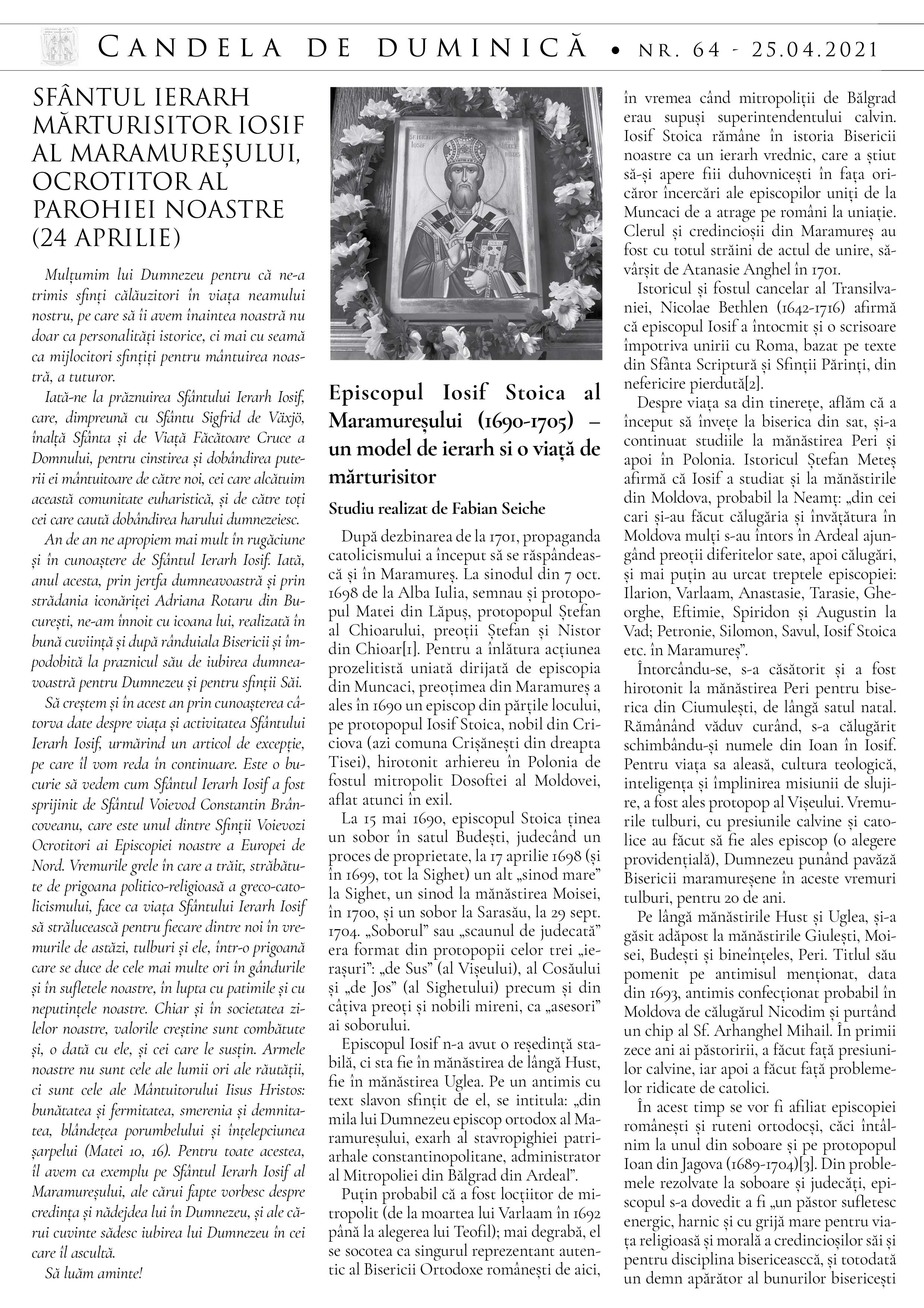 Atașăm și foaia parohială din această duminică, să vă fie spre folos și spre o mai bună cunoaștere a vieții mărturisitoarei a Sfântului Ierarh Iosif al Maramureșului, ocrotitor al parohiei noastre.