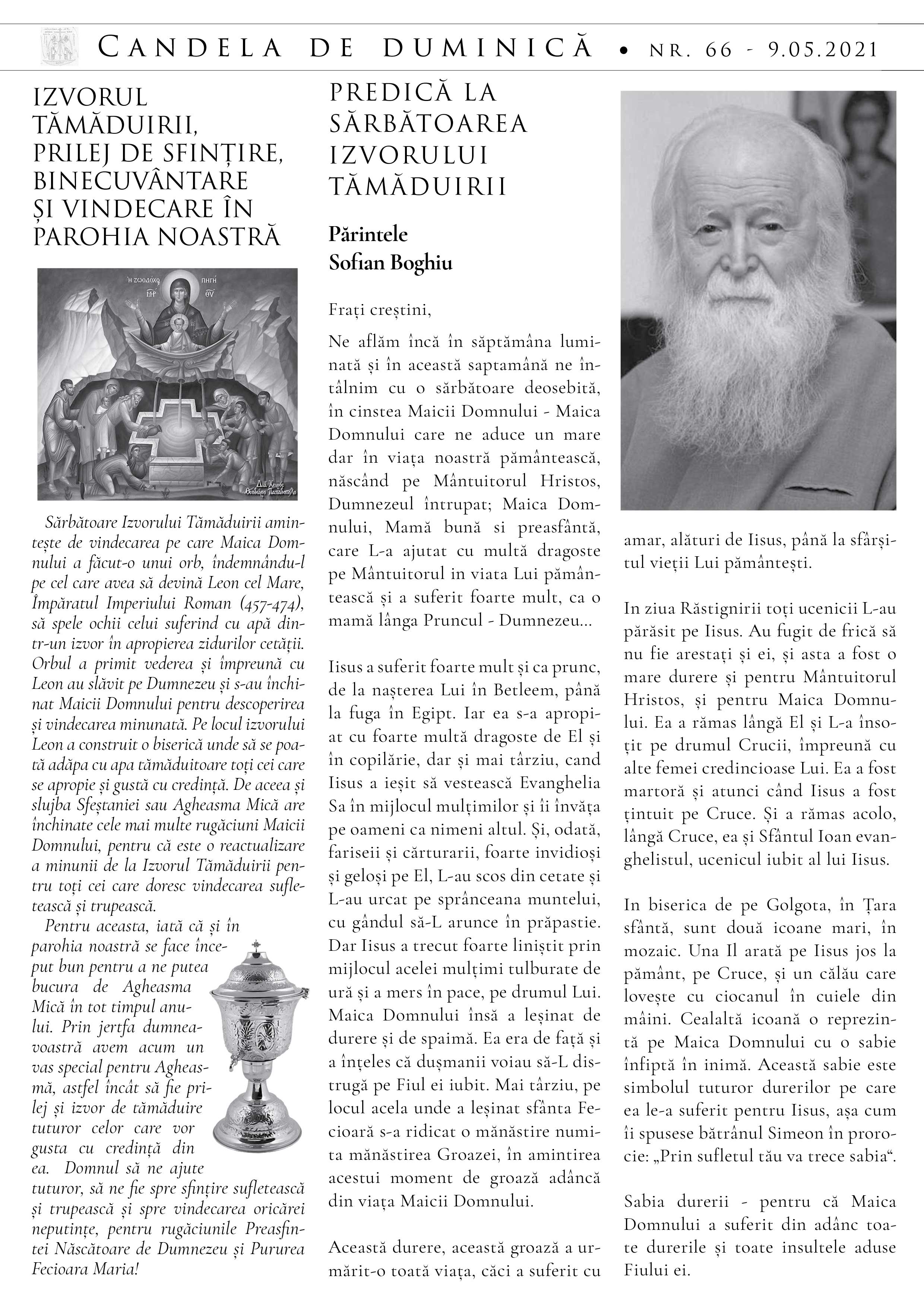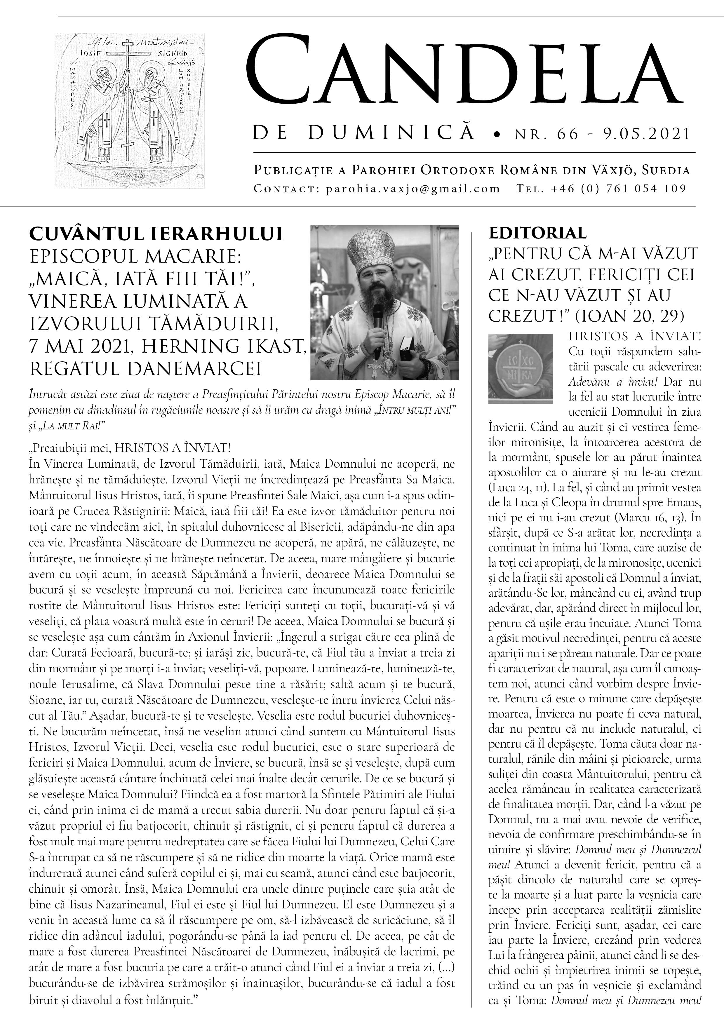 Hristos a înviat! Vă atașăm foaia parohială din această duminică prin care trimitem urările de La Mulți Ani! și La Mult Rai! Preasfințitului Părinte Episcop Macarie, cu ocazia zilei sale de naștere sărbătorită astăzi. Felicitări, de asemenea, dnei Manuela-Camelia Văsuianu, sărbătorită ieri, precum și, anticipat, dlui Bogdan Ganciu, pe care îl vom sărbători săptămâna aceasta, pe 13 mai, bucurie, sănătate și pace de la Dumnezeu în toate!